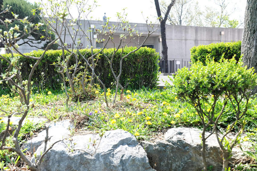 신록으로 반짝이는 회양목의 푸르름도 좋고, 노란색 민들레꽃도 좋습니다.