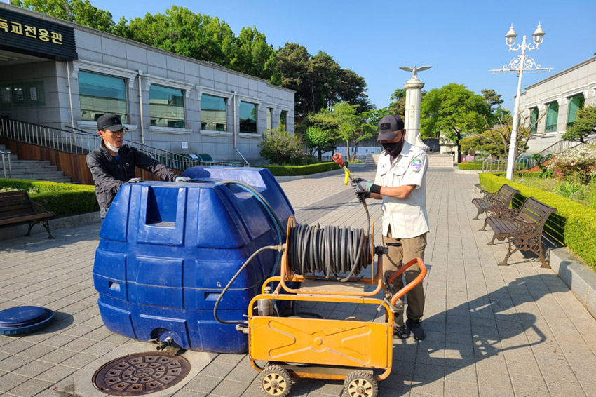 이른 아침에 광장과 진입로등의 정원수들에게 진딧물방제제와 영양제를 살포했습니다.