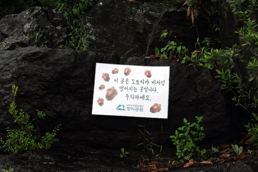 청아동산 입구에 도토리 낙하주의 안내문을 붙여두었습니다.