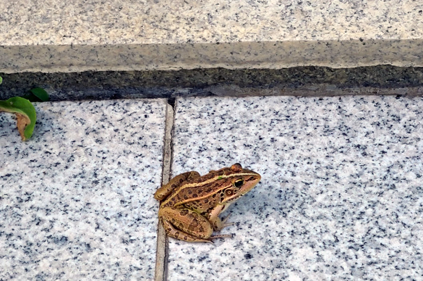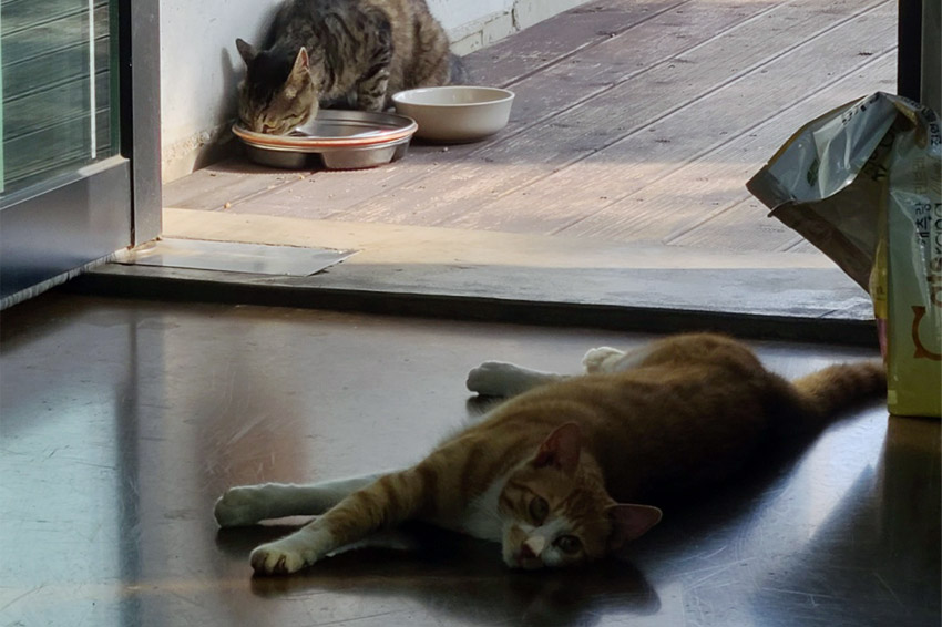 급식 먹으러 오는 고양이 손님들과 이곳저곳 보이는 청개구리와 개구리 친구들입니다.