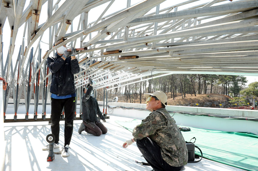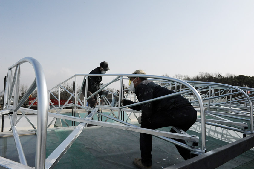 새 가림막을 씌우기 전에 프레임 전체 방청도색과 함께 보강작업도 진행했습니다.
