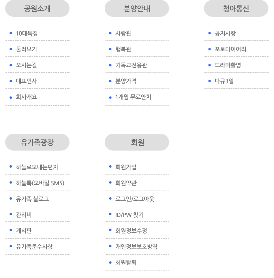 10대특징 둘러보기 오시는길 대표인사 회사개요 사랑관 행복관 기독교전용관 분양가격 1개월 무료안치 공지사항 포토다이어리 드라마촬영 다큐3일 하늘로보내는편지 하늘톡(모바일 SMS) 유가족 블로그 관리비 게시판 유가족준수사항 회원가입 회원약관 로그인/로그아웃 ID/PW찾기 회원정보수정 개인정보보호방침 회원탈퇴